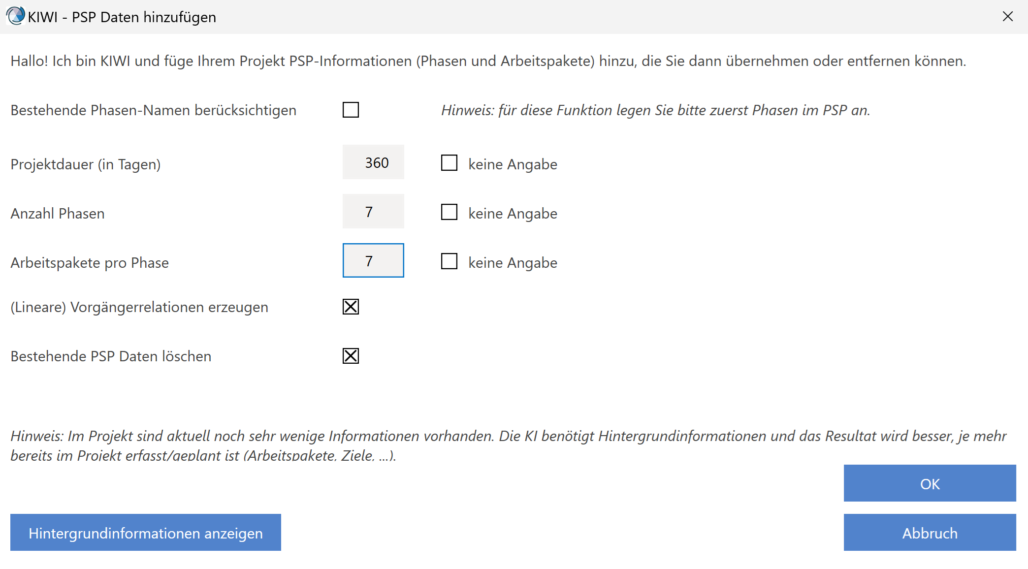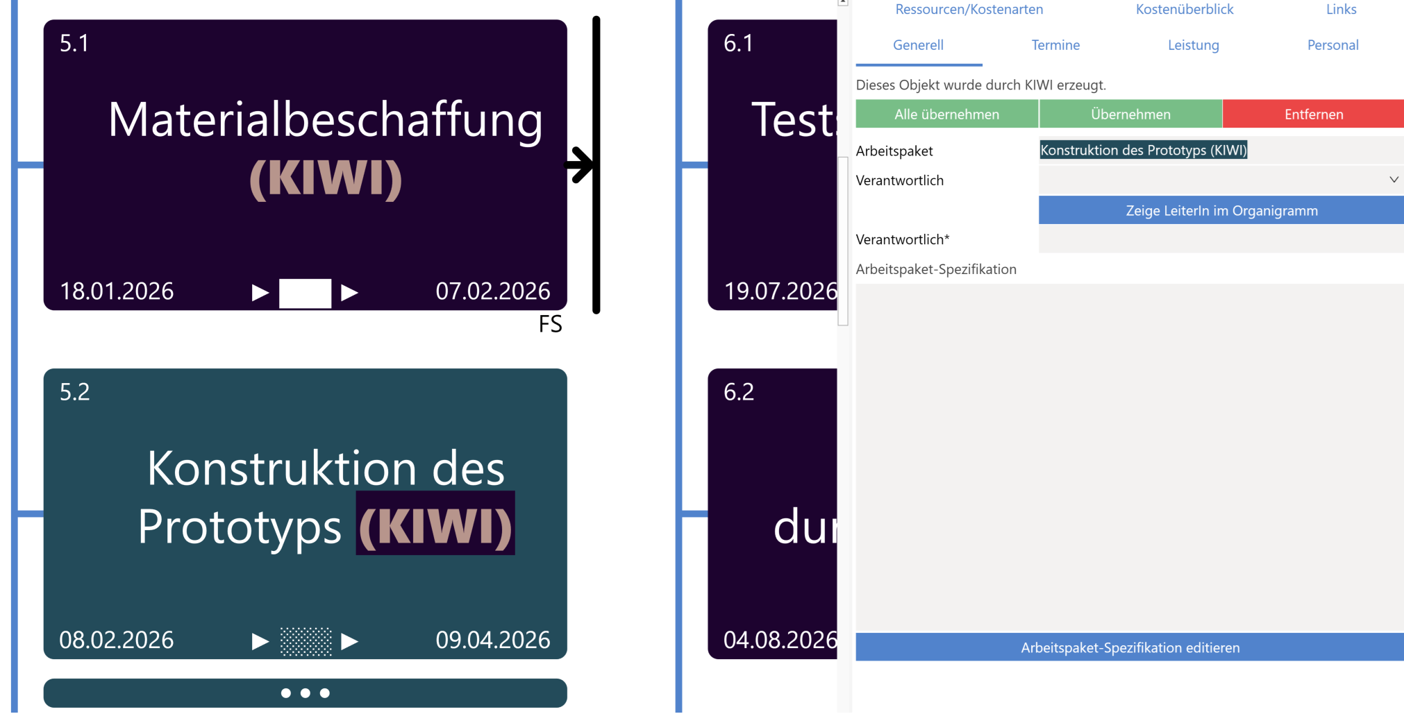 Ein paar Sekunden danach schlägt KIWI Ihnen einen Projektstrukturplan vor - den sie natürlich prüfen und ggf. adaptieren sollten.